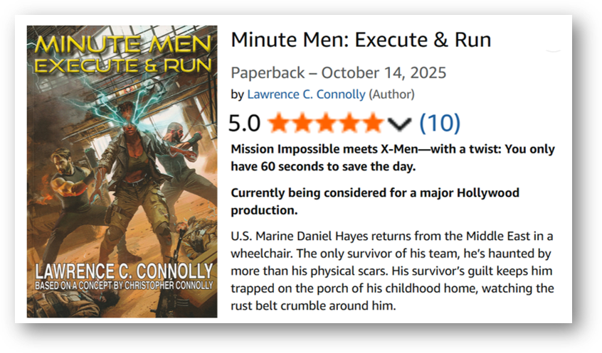 Minutemen: Execute & Run drops readers into the middle of the action with hardly an explanation, taking them along for the ride, and forcing them to use their own wits to figure out the who, what, where, when, and why. The action scenes sizzle off the pages, careening from cliffhanger to cliffhanger. With only 60 seconds at a time for the book’s heroes to use their newfound powers, the ever-present countdown pulls readers along this fast-paced tale filled with action, camaraderie, and sacrifice. Connolly expertly weaves in background stories for each of the characters, enhancing their depth while drawing the reader into their world. So strap in, gather your wits, and dive into this page-turner! You won’t be disappointed. —K. Ceres Wright, author of Cog, co-author of Too Old to Dance but Young Enough to Rock ‘n’ Roll.