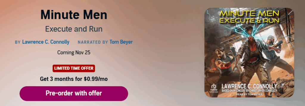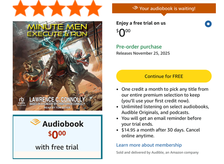 To find out if you qualify, simply go to the Minute Men: Execute & Run page on Amazon and see if the $0.00 audiobook offer appears. If it does, click on the free-trial button and follow the prompts to place your preorder. You can cancel your Audible membership anytime and still keep the book, but if you’re like me, you might keep the membership. With well over half a million titles to choose from, Audible is hard to beat.