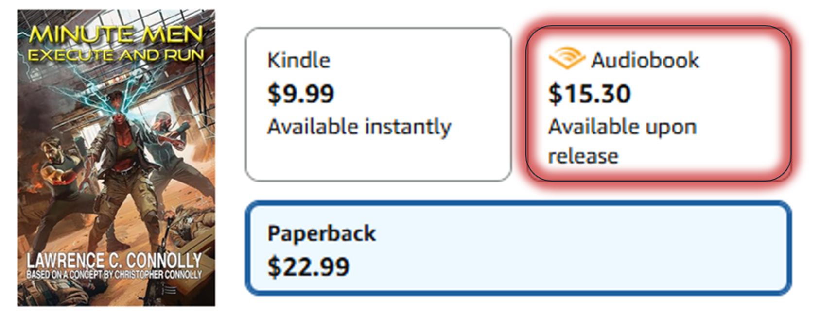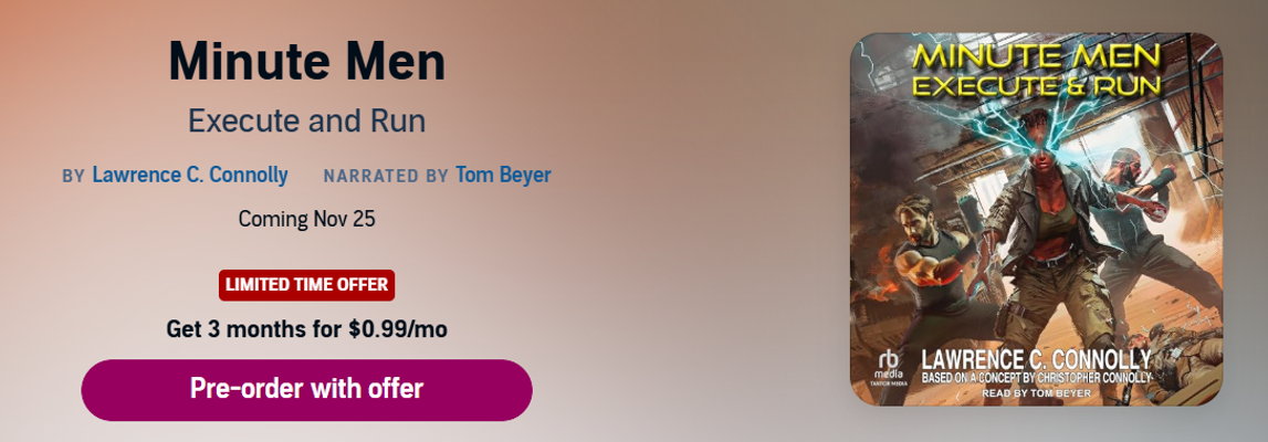 To find out if you qualify, simply go to the Minute Men: Execute & Run page on Amazon and see if the $0.00 audiobook offer appears. If it does, click on the free-trial button and follow the prompts to place your preorder. You can cancel your Audible membership anytime and still keep the book, but if you’re like me, you might keep the membership. With well over half a million titles to choose from, Audible is hard to beat.